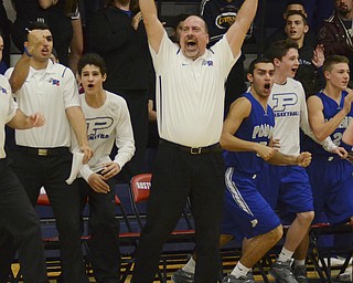 Katie Rickman | The Vindicator.Poland's Nick Bucieri (#15) shoots a basket and scores against Fitch's Brian Beany (#33) during the fourth period of the game at Fitch High School on Tuesday night.