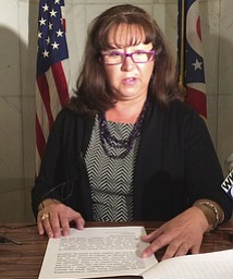 ROBERT K. YOSAY | THE VINDICATOR..Carol McFall, long-time chief deputy Mahoning County auditor, who was fired Wednesday by the new Auditor Ralph T. Meacham, speaks to the press in front of her former courthouse office...