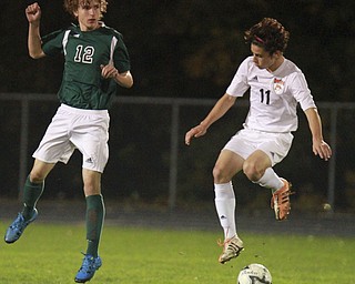 William D Lewis The Vindicator Howland's David Schwartz(10) reacts after scoring during1rsthalf of 10-21-15 game with Nordonia at Howland. At left is Matt Seem(6).
