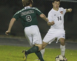 William D Lewis The Vindicator Howland's David Schwartz(10) reacts after scoring during1rsthalf of 10-21-15 game with Nordonia at Howland. At left is Manny Perez(3)