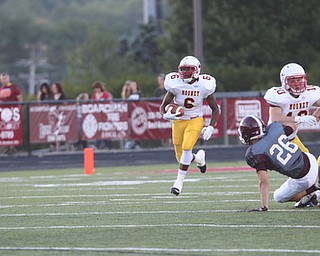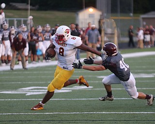 . ROBERT K. YOSAY | THE VINDICATOR..Mooneys #8 Ray Anerson Breaks a tackle by Boardmans #44 Nick Patoray as he leaves the backfield during first quarter action..Boardman Spartan New Stadium as Cardinal Mooney ..-30-