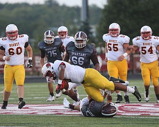 . ROBERT K. YOSAY | THE VINDICATOR..Mooneys #14 Jack Lynch recovers his own fumble as Boardmans #1 Koby Adu-Pku tackles him..Boardman Spartan New Stadium as Cardinal Mooney ..-30-