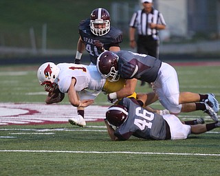 Jeff Lange | The Vindicator SEPTEMBER 4, 2015 - McDonald's Joe Perry (15) is brought down by Springfield's Zach Barber (9) as McDonald's Hunter Kutsch (51) tackles Springfield's Jake Ford during first quarter action at …