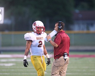 . ROBERT K. YOSAY | THE VINDICATOR..Mooneys #5 Mike WIlliams can only watchas Boardmans #10 Travis Koontz hauls in a short pass for Boardmans First .. first and ten....Boardman Spartan New Stadium as Cardinal Mooney …
