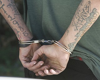 William d Lewis the vindicator A man arrested on outstanding warrant violations is frisked near corner of Erie and Lucius on Yownstown's Southside by Community Police officers Kristina Vaughan and Joe Moran Tuesday afternoon.