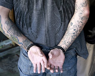 William d Lewis the Vindicator A man is arrested in a vacant garge on Youngsotwn's Southside where police syringes and drug equipment Tuesday 9-22-15.