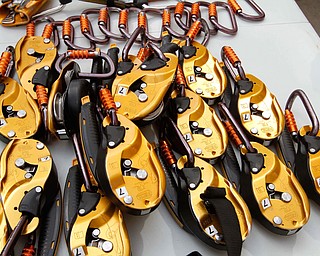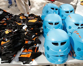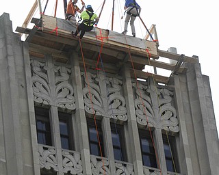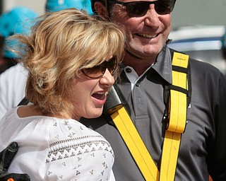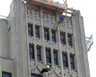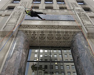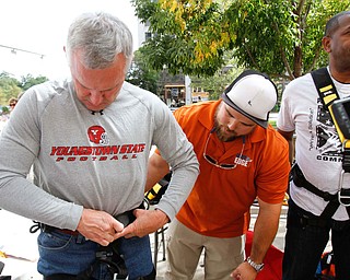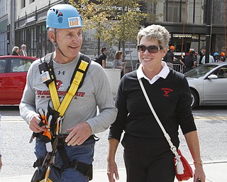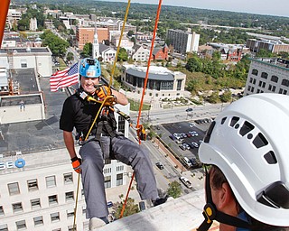 ROBERT K. YOSAY | THE VINDICATOR..YSU president Jim Tressel gives the thumbs up just before stepping back off the building,..,