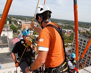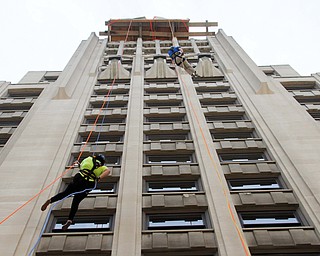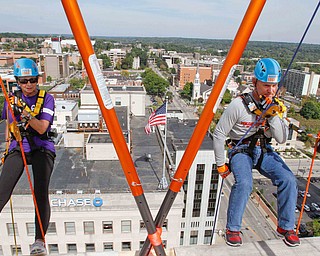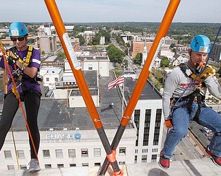 ROBERT K. YOSAY | THE VINDICATOR..As Sister Janet Gardner and Caitlyn Cobbs repal down the 17 floors - as part of the Beatitude fund raiser . Each participant pays over 1000 dollars to repal down