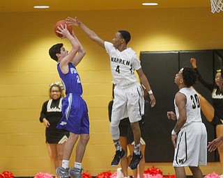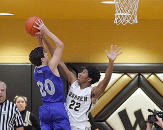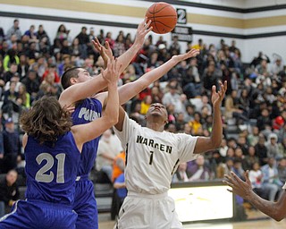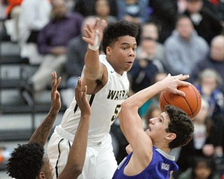 ROBERT K. YOSAY | THE VINDICATOR..Blocked by #14 Jacob Burns with a an arm in #! Hardings Derek Culver moves to the basket in front of Poland Defender #21Jake Buccieri - during second quarter action …