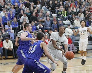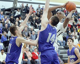 Jeff Lange | The Vindicator FRI, FEB 5, 2016 - Mooney's Trell Thomas (center) looks to the basket for two between Ursuline's Anthony Howell (5) and Armon Nasseri (33) in the second half of their …