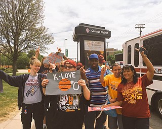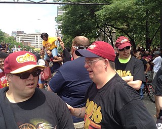 CLEVELAND, OHIO - JUNE 22, 2016: Cavaliers fans hang out in a small plaza on East 9th Street Wednesday morning before the Cavaliers Championship Parade. DAVID DERMER | THE VINDICATOR