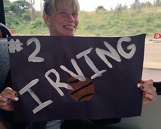 Cleveland Cavaliers' Kyrie Irving stands on the roof of a pickup truck to greet fans before the start of a parade celebrating the Cleveland Cavaliers' NBA Championship in downtown Cleveland Wednesday, June 22, 2016. (AP …