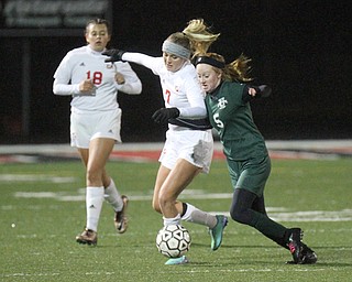 William D. Lewis the Vindicator Mooney's Colleen Durkin(8) and Ursuline's Adi Quattro(4) go for the ball during 10272016 action at Girard.