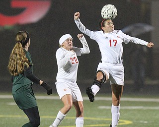 William D. Lewis the Vindicator Mooney's Elizabeth Philibin(17 and /ursulines Abby Price (5) and ) and Ursuline's Breanna Bowell(13) go for the ball during 10272016 action at Girard.