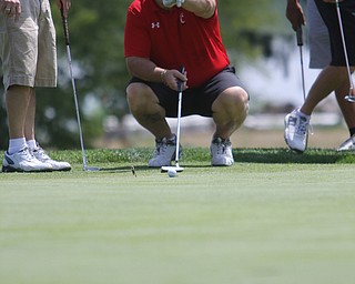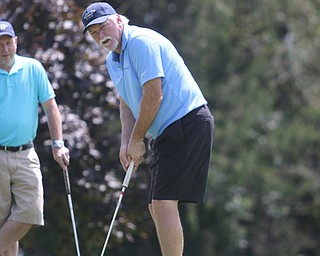 POLAND, OHIO - AUGUST 14, 2017: Jamie Palumbo, white, and Scott Hoff, red, react after Palumbo's approach shot just missed the hole on the 15th hole during the 2017 Greatest Golfer of the Valley scramble …