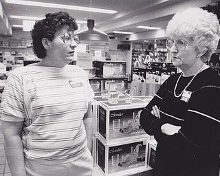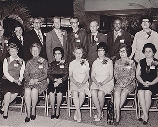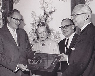 Jerold S. Meyer (second from right), general manager of Strouss--Hirshberg Co., receives a plaque designating him as "Boss of the Year" from Mrs. Marie Dunn, president of Youngstown chapter, American Business Women's Association, at the …