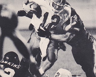 YSU'S DARNELL CLARK ELUDES MARSHALL'S TUAN REYNOLDS #6 ABD RACES MANY YARDS FOR YSU'S FIRST TOUCHDOWN. Dec. 18, 1993 Bob DeMay | The Vindicator File Photo
