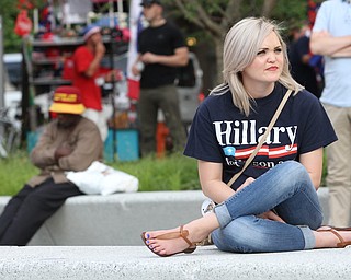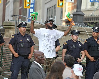 Nikos Frazier | The Vindicator..Two protestors argue in Cleveland's Public Square on the fourth and final day of the Republican National Convention.