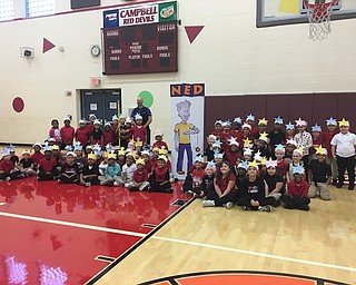 Above, Boardman Center students hold signs thanking Moore for his visit. Standing in back row, from left, are Jayden Doerr, Isabel Klisiewicz, Laci Jurus, Moore, Thomas Amon and Eric Konik. Middle row, kneeling, from left, …