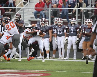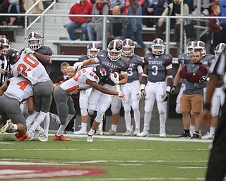 ROBERT K. YOSAY | THE VINDICATOR..Howland Tigers at Boardman Stadium .Boardmans #6 Joe Ieraci is tackled high by Howlands #1 Samari Dean... saving a run back..Second Quarter action Howland Tigers at Boardman Stadium
