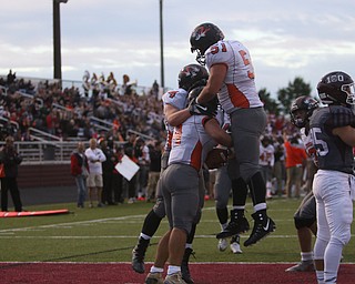 ROBERT K. YOSAY | THE VINDICATOR..Howland Tigers at Boardman Stadium ..Boardmans #7 Keyshawn Colmand and #4Alex Huzicka celebrate Boardmans third quarter TD