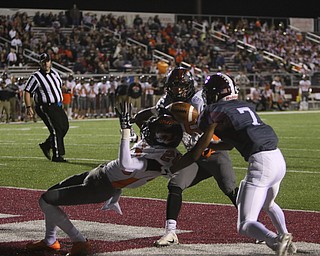 ROBERT K. YOSAY | THE VINDICATOR..Boardmans #7 Keyshawn Colman pulls in a sidelin pass as Howlands #33 Jonny Elliot defends..Second Quarter action Howland Tigers at Boardman Stadium