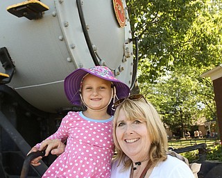 Tricia Calzo, right, of Boardman, holds her daughter Charlotte Calzo, 2, on her lap as they ride the fun slide with Charlotte's cousin Zoe Bayer, 7, at the Canfield Fair on Thursday. EMILY MATTHEWS | …