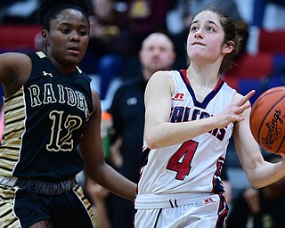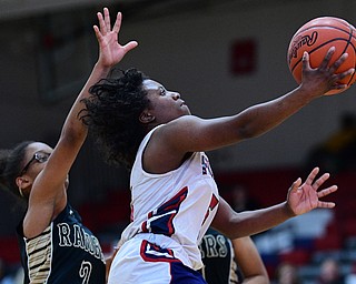 AUSTINTOWN, OHIO - FEBRUARY 21, 2019: Fitch's Jada Lazara goes tot he basket against Harding's Diamond Phillips during the second half of their sectional finals game, Thursday night at Austintown Fitch School. Fitch won 49-33. …