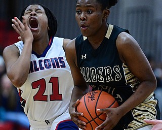 AUSTINTOWN, OHIO - FEBRUARY 21, 2019: Fitch's Sabria Hunter drives on Harding's Gia Green during the second half of their sectional finals game, Thursday night at Austintown Fitch School. Fitch won 49-33. DAVID DERMER I …