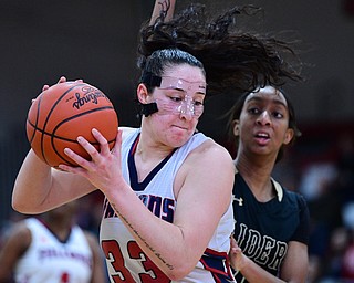 AUSTINTOWN, OHIO - FEBRUARY 21, 2019: Fitch's Emma Bartlett grabs a rebound away from Harding's Nalida McQueen, left, and Gia Green during the first half of their sectional finals game, Thursday night at Austintown Fitch …