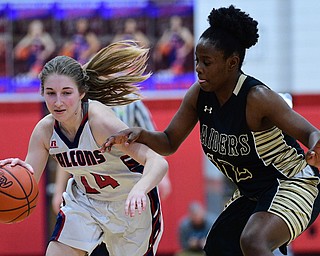 AUSTINTOWN, OHIO - FEBRUARY 21, 2019: Fitch's Emma Bartlett drives on Harding's Kamarah Bender during the second half of their sectional finals game, Thursday night at Austintown Fitch School. Fitch won 49-33. DAVID DERMER I …