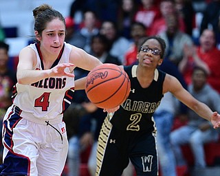 AUSTINTOWN, OHIO - FEBRUARY 21, 2019: Fitch's Taylor Fronk dribbles away from Harding's Diamond Phillips after a take away during the second half of their sectional finals game, Thursday night at Austintown Fitch School. Fitch …