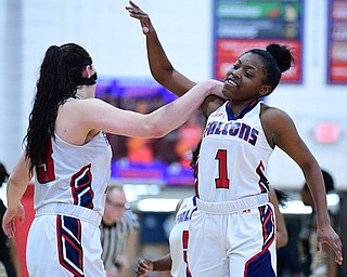 AUSTINTOWN, OHIO - FEBRUARY 21, 2019: Fitch's Mia Jackson, right, celebrates with Sabria Hunter after defeating Harding 49-33 in their sectional finals game, Thursday night at Austintown Fitch School. DAVID DERMER I THE VINDICATOR