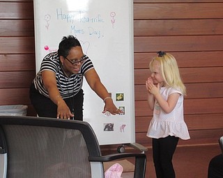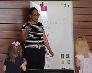 Children's librarian Rhonda Monroe helped children match baby animals with their moms at the Tea-Riffic Moms event.