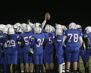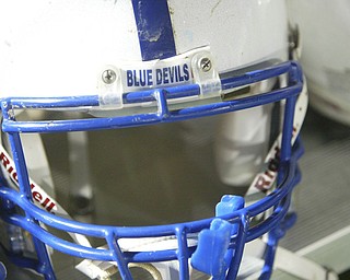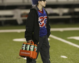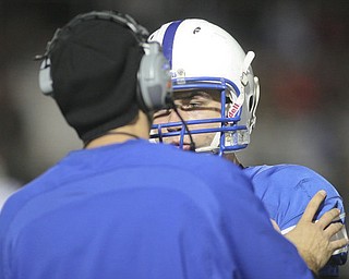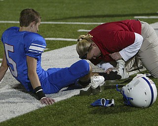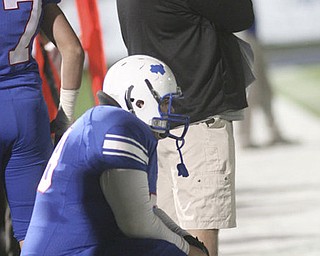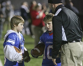 ROBERT K. YOSAY | THE VINDICATOR --..Jeff Clegg is stopped after getting afirst down in the first drive in the third quarter by #7 Shawn Ball and 75 Tyler Litten - behind them #77 Aaron Halls - ..Regional quarter final at Western Reserve Stadium - Western Reserve Blue Devils VS …