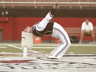 ROBERT K. YOSAY | THE VINDICATOR..Brought down during first quarter action is Mooneys' (15) Denver Martin after a short gain by Boardmans (8) Ryan Savage..Bdm @ Mooney - Stambaugh Stadium... - -30-..