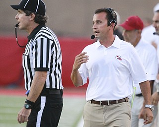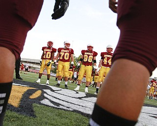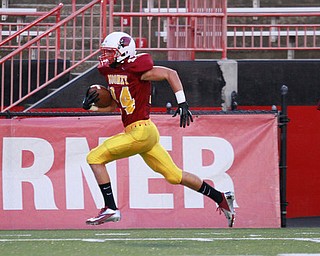ROBERT K. YOSAY | THE VINDICATOR..Mooneys #10 Justis Ellis Moore scampers for a second quarter touchdown as #68 Bdm no name on roster - and #51 Justin Gardner look on ..Bdm @ Mooney - Stambaugh Stadium... - -30-..