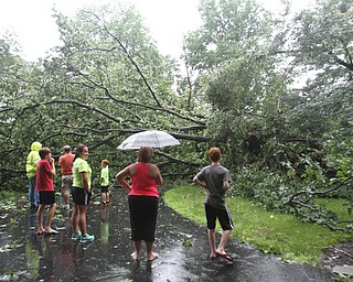 William D Lewis The Vindicator MAry Baumeier looks at a treefell onher Ravine Drive home in Liberty Wed during heavy storms. A large oak tree fell and partially landed on her house. no one was injured.